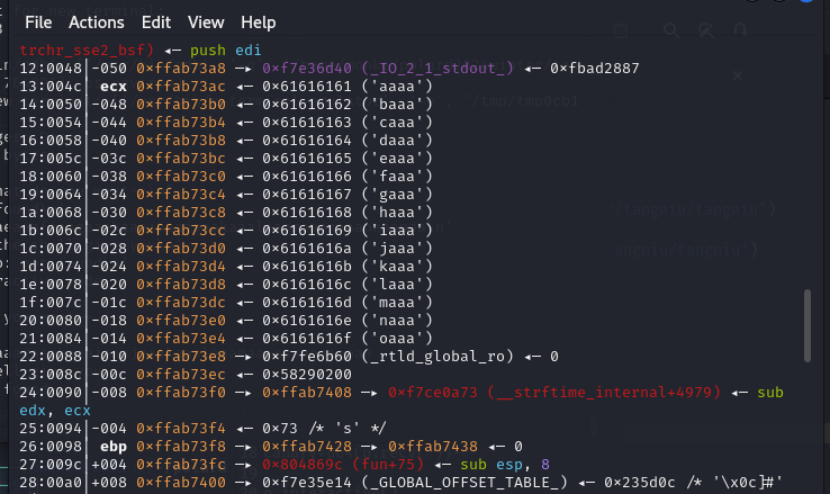 我一开始的思路是用printf来泄露canary,但是很快发现做不到,因为只有一个read。那用fmt来泄露呢?通过动调得到基础偏移是7,canary的偏移是23,如图: