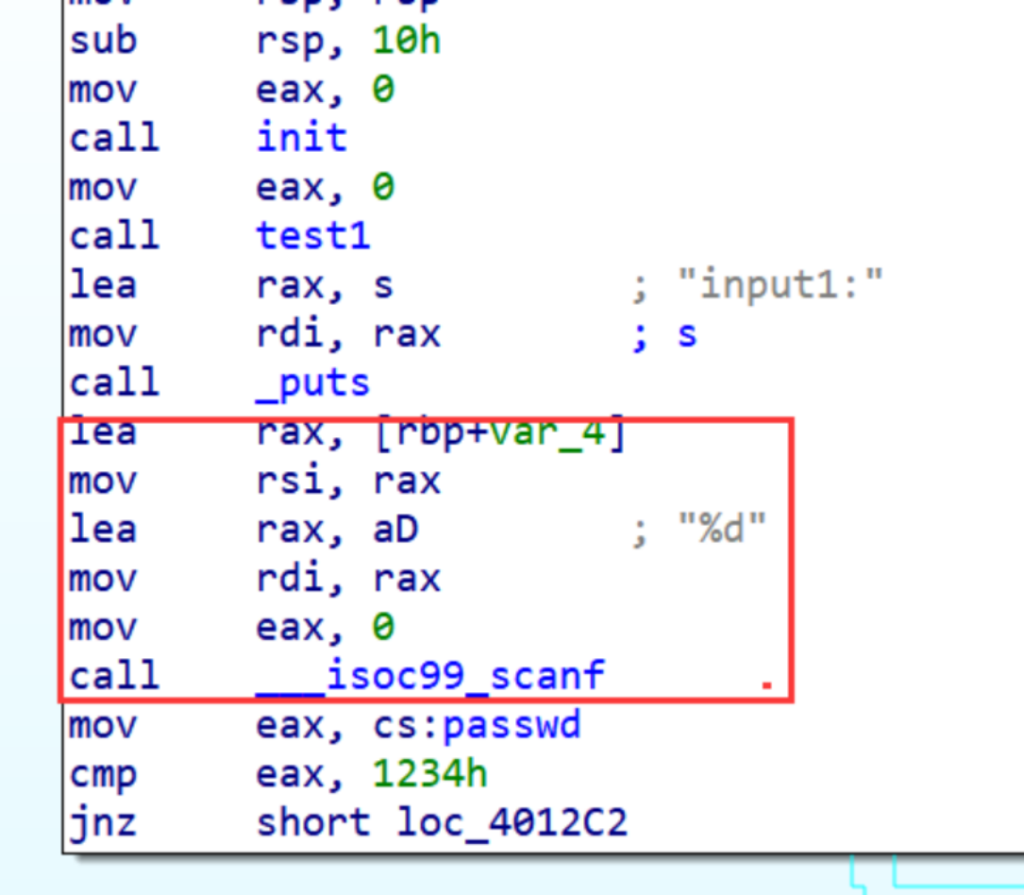 在64位程序中,scanf的写入地址是从rsi寄存器得到的,而rsi寄存器又与rbp有关,如下所示: