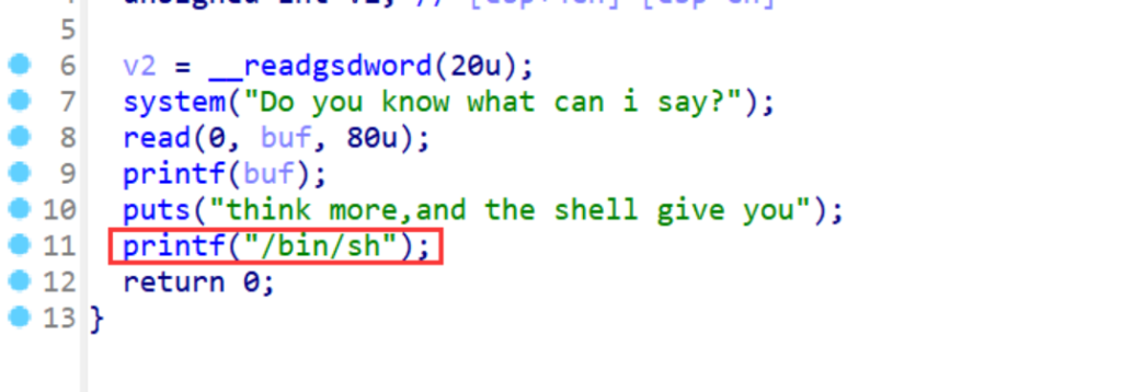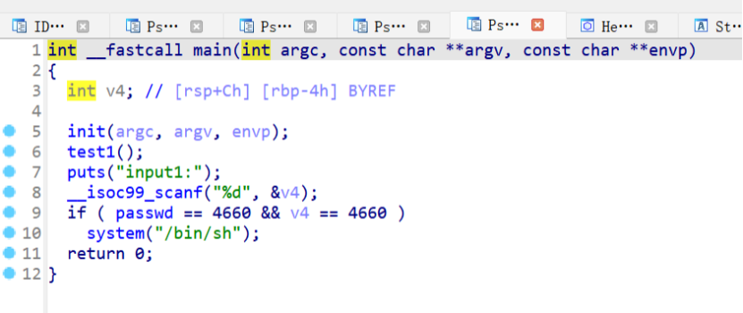 main函数,判断passwd和v4是不是都等于4660,是的话就给shell,其中passwd是在bss段的全局变量,v4是在栈上由用户输入的变量