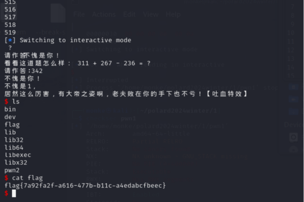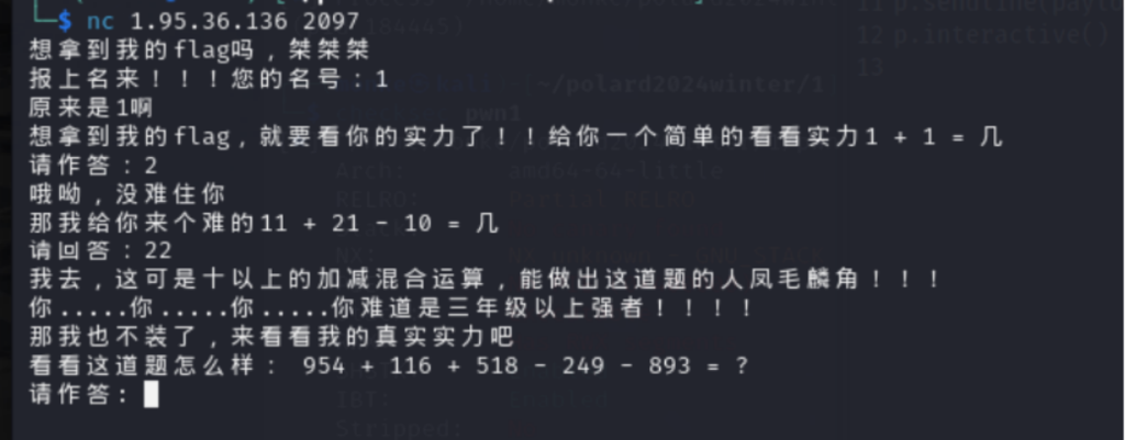 题目没给附件,nc过去是一连串的计算,输入答案对了就继续,错了就退出程序,如图: