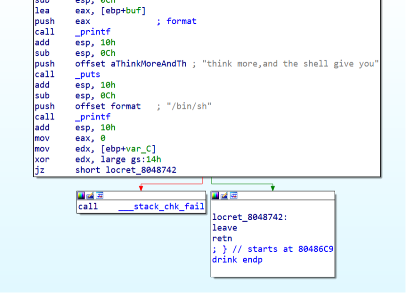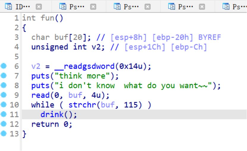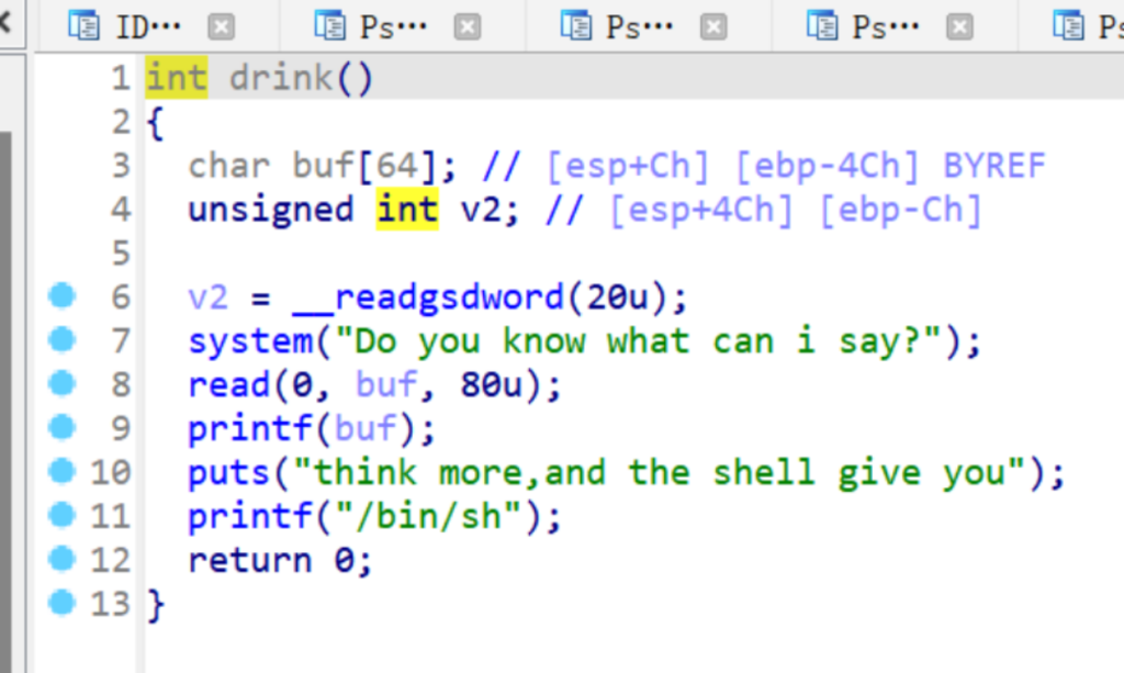 但是打了好多次都发现会检测到canary被篡改,有点疑惑,按理来说canary应该没问题才对。后来仔细想明白了,第一次和第二次进入drink时候的canary值不一样,用前一次的canary肯定就不行,那就只能继续找别的办法。