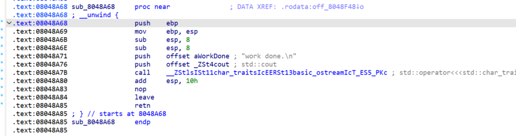 继续跟进,这0x8048a68就是个函数,功能是输出”work done”: