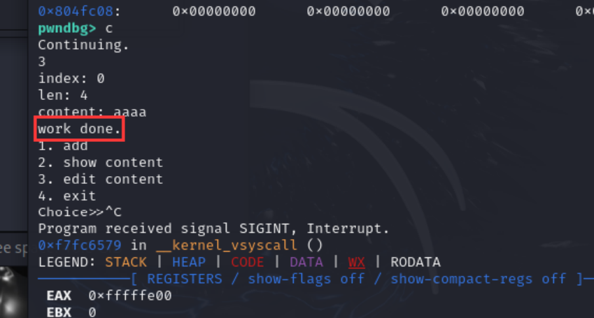 然后又是两次取值,第一次从chunk(data域)取值取到0x8048f48,第二次从0x8048f48取值取到0x8048a68,然后作为函数执行,执行的功能是输出”work done”。