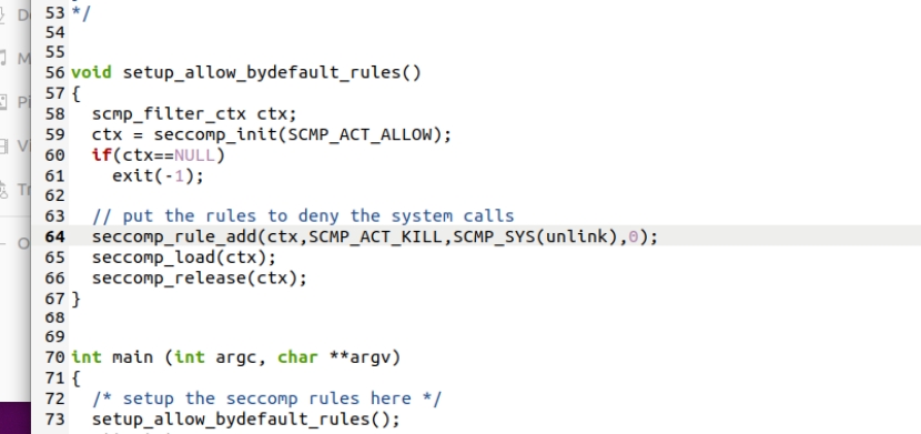 seccomp_rule_add(ctx,SCMP_ACT_KILL,SCMP_SYS(unlink),0);