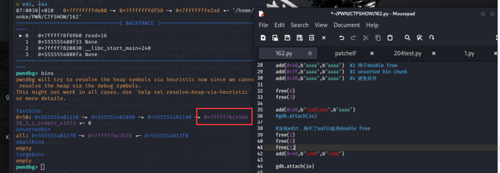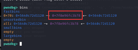 而通过unsorted bin可以泄露main_arena。但是题目给的add限制大小,无法free到unsortedbin里面,所以需要通过double free来篡改某个chunk的size,使其free掉后能进入unsorted bin.