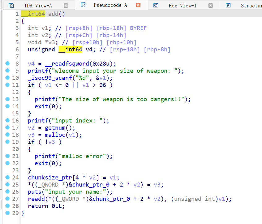 add函数:自定义chunk_size、chunk_index、chunk_data,开辟两个数组,一个存chunk的size大小,一个存chunk的指针。add的大小被限制在fastbin范围内。