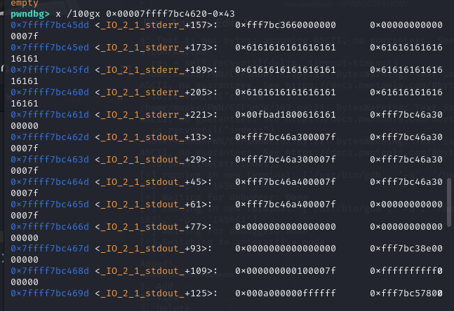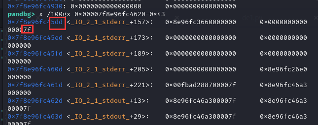 假设一开始_IO_write_base=_IO_write_end=0x7abcdef,如果把_IO_write_base改成0x7abcd00,下次调用puts、write等函数时就会把0x7abcd00到0x7abcdef所有内容打出来,里面会有libc基地址相关地址,由于偏移固定,所以就能算出libc基址,达到了泄露目的。