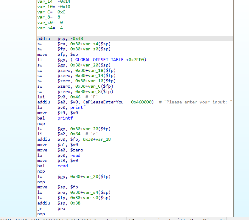 打法很简单,溢出覆盖返回地址即可。由于是异架构,侧重点在于学习分析一下汇编代码。