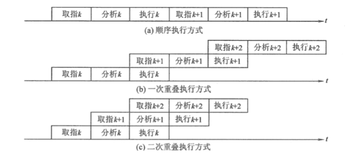 本应顺序执行的几条指令同时执行,只不过处于不同的执行阶段(一般指令执行阶段包括:取指、间指、执行、中断)如下图所示,参考二次重叠执行方式,第一条指令在执行时候,第二条指令在分析,第三条指令在取指。