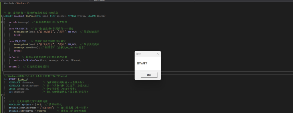 MessageBoxW(hwnd, L"窗口创建了", L"提示", MB_OK);  // 显示创建提示